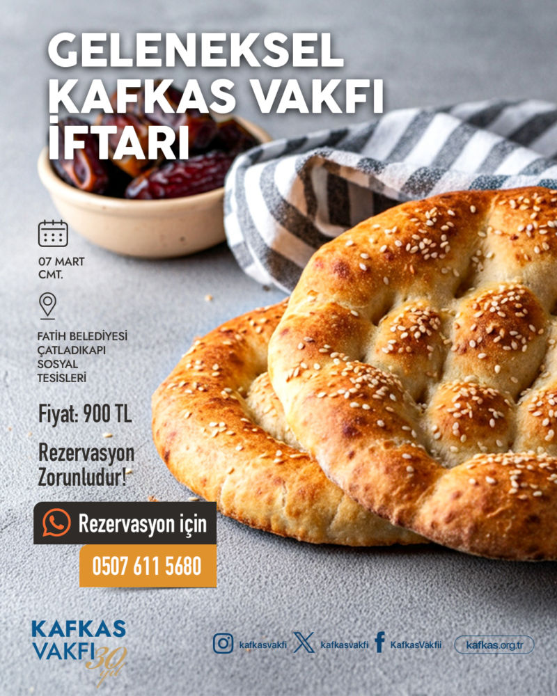 Kafkas Vakfı olarak Ramazan ayının bereketini, kardeşliğini ve muhabbetini aynı sofrada paylaşmak üzere sizleri Geleneksel Kafkas Vakfı İftarı’na davet ediyoruz.